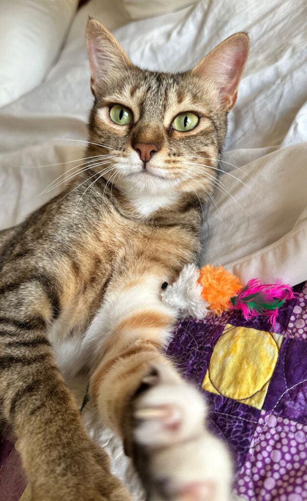 Matilda – liebevoll Tilly genannt – ist etwa ein Jahr alt und eine junge, verspielte Katze voller Energie und Lebensfreude. Sie liebt es, Bällchen hinterherzujagen, Spielmäuse durch die Wohnung zu tragen und mit der Spielangel zu toben. Nach dem Spielen kuschelt sie gerne und genießt die Nähe ihrer Menschen.